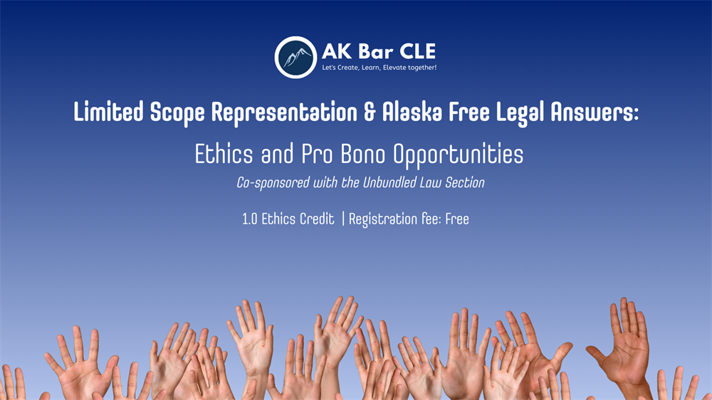 This 1-hour virtual CLE explores how Alaska attorneys can ethically provide limited scope (unbundled) legal services while expanding access to justice through pro bono opportunities. This program will cover the rules and best practices for limited scope representation in Alaska. We will also provide an overview of the Alaska Free Legal Answers (Alaska.freelegalanswers.org) platform and how attorneys can participate in this online clinic to assist self-represented litigants.